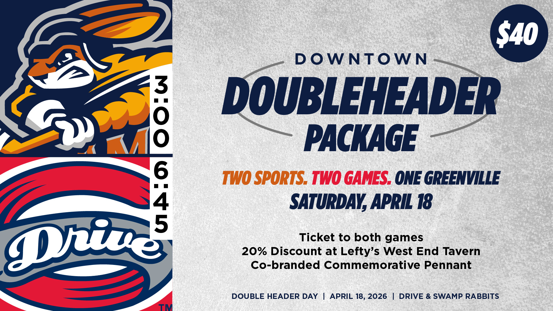 Experience the ultimate day of Greenville sports with our exclusive Greenville Drive x Greenville Swamp Rabbits Doubleheader on April 18th! Start your afternoon cheering on the Swamp Rabbits at 3:00 PM, then head over to Fluor Field for a 6:45 PM first pitch with the Greenville Drive.
